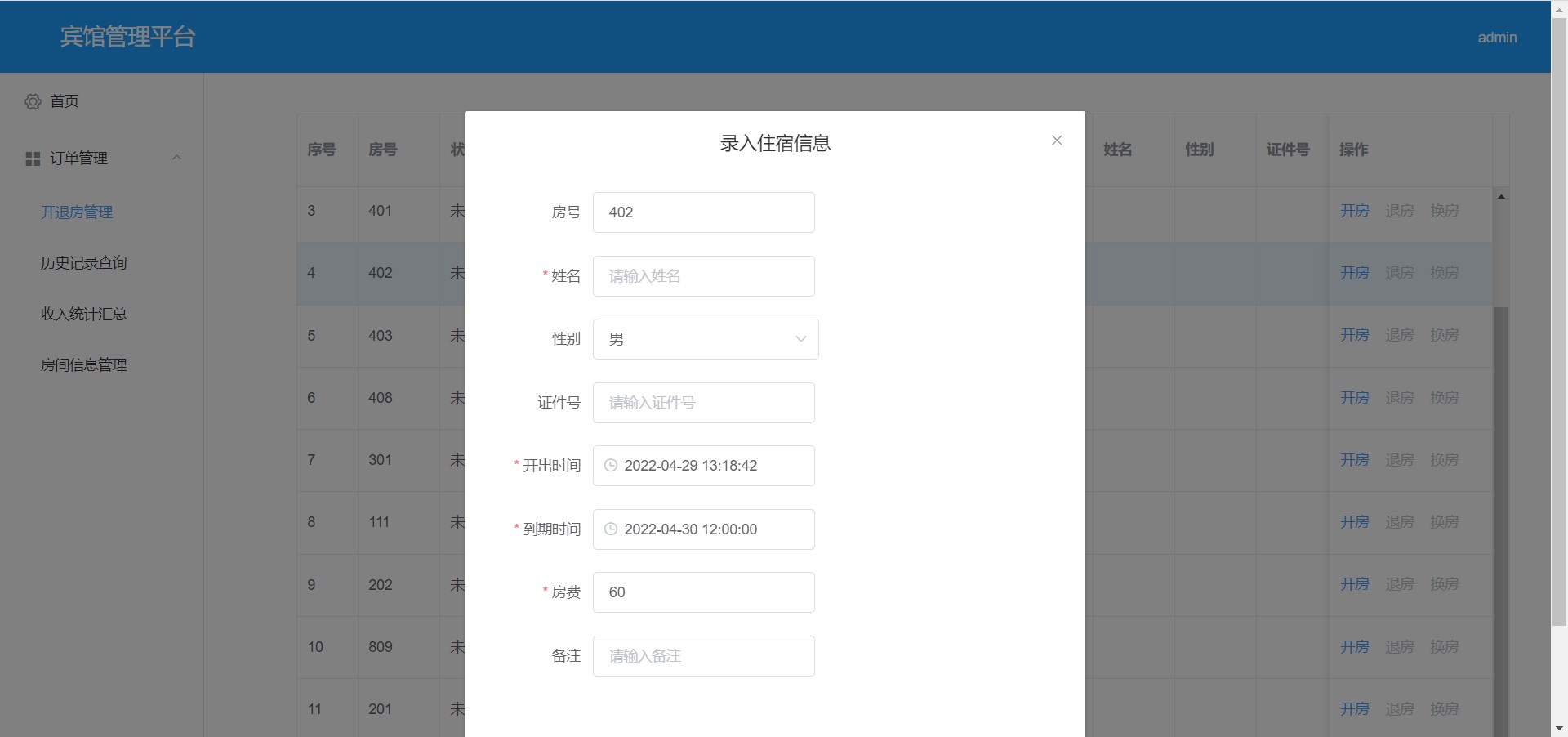 基于SSM+MYSQL+Vue的宾馆管理系统,管理员角色。整体功能包含首页登录,开房管理,历史记录查询,收入统计汇总,房间管理。用户调整房间等。