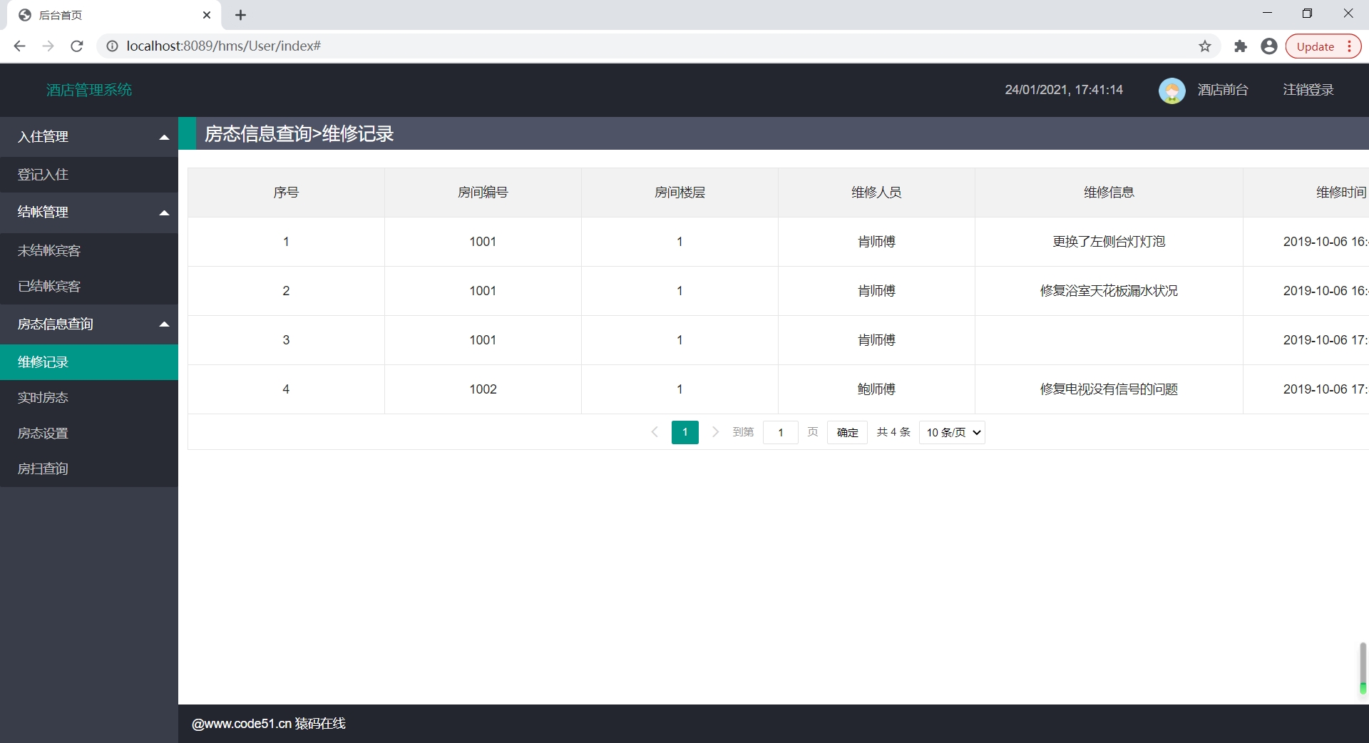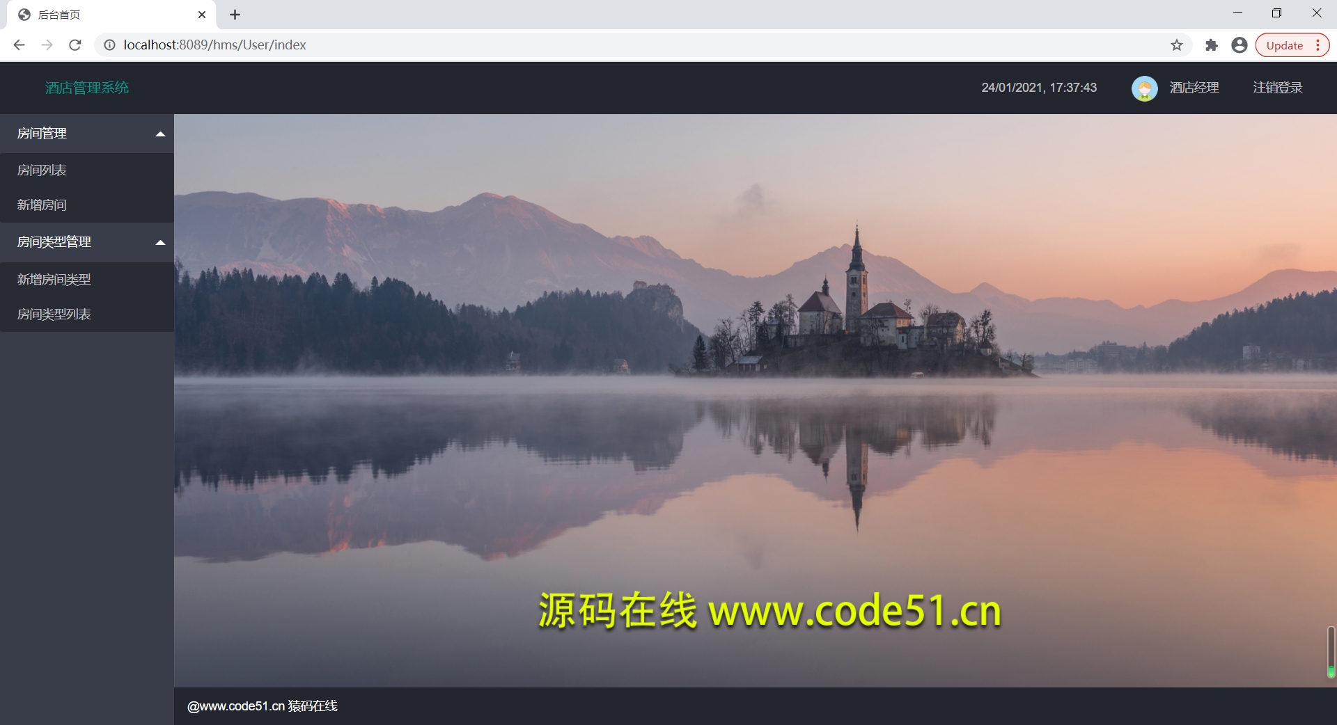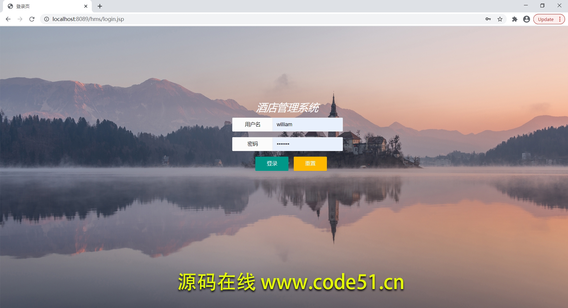 酒店管理系统,系统整体架构采用了JSP+Servlet+JDBC模式,分为管理员,酒店前台,酒店经理三种用例角色。项目启动后访问登录页面,输入管理员账号admin登录系统。管理员端包含了用户管理,用户角色管理。管理员可以管理系统中存在的所有用户,例如酒店前台,酒店经理等。管理员可以录入用户信息。用户信息包含员工编号,账号,用户名,性别,用户类型等。角色列表展示系统中所有用户的类型,不同的用户类型对应不同的角色以及权限。在角色页面中可以查看,新增,编辑,删除,用户角色权限。角色权限包括,角色名称,角色描述。退出系统后,输入酒店经理账号密码william,酒店经理包含了房间管理,房间类型管理。房间管理包含了房间的增加,删除,修改等功能。具体而言房间信息包括房间编号,房间名称,房间价格,房间计价方式,预订价格等信息。房间类型管理包含了房间类型编号,类型名称,价格等。在登录页面输入酒店前台账号密码smith。酒店前台功能包括入住管理,结账管理,房间信息查询。入住管理可以实现用户的登记入住,登记信息包括宾客姓名,证件类型,证件号码,手机号码,入住日期,离店日期,房间号码,押金数量,宾客性别,备注信息。同行宾客信息等。结账管理宾客结账离开,宾客续租等功能。在该列表中可以看到宾客姓名,入住房间,入住时间,预计离店时间,入住天数。已收押金。续租可以延长预计离店日期信息。房间动态信息包含了所有房间的状态信息,例如清洁中,空闲,维修中等。
