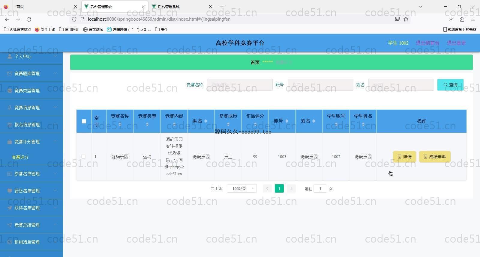 学生功能有个人中心,竞赛题库管理,竞赛类型管理,竞赛信息管理,报名信息管理,竞赛评分管理,参赛名单管理,晋级名单管理,获奖名单管理,竞赛总结管理,报销清单管理,成绩申诉管理,参赛信息管理,参赛信息管理,往年成绩管理,获奖情况管理。因而具有一定的实用性