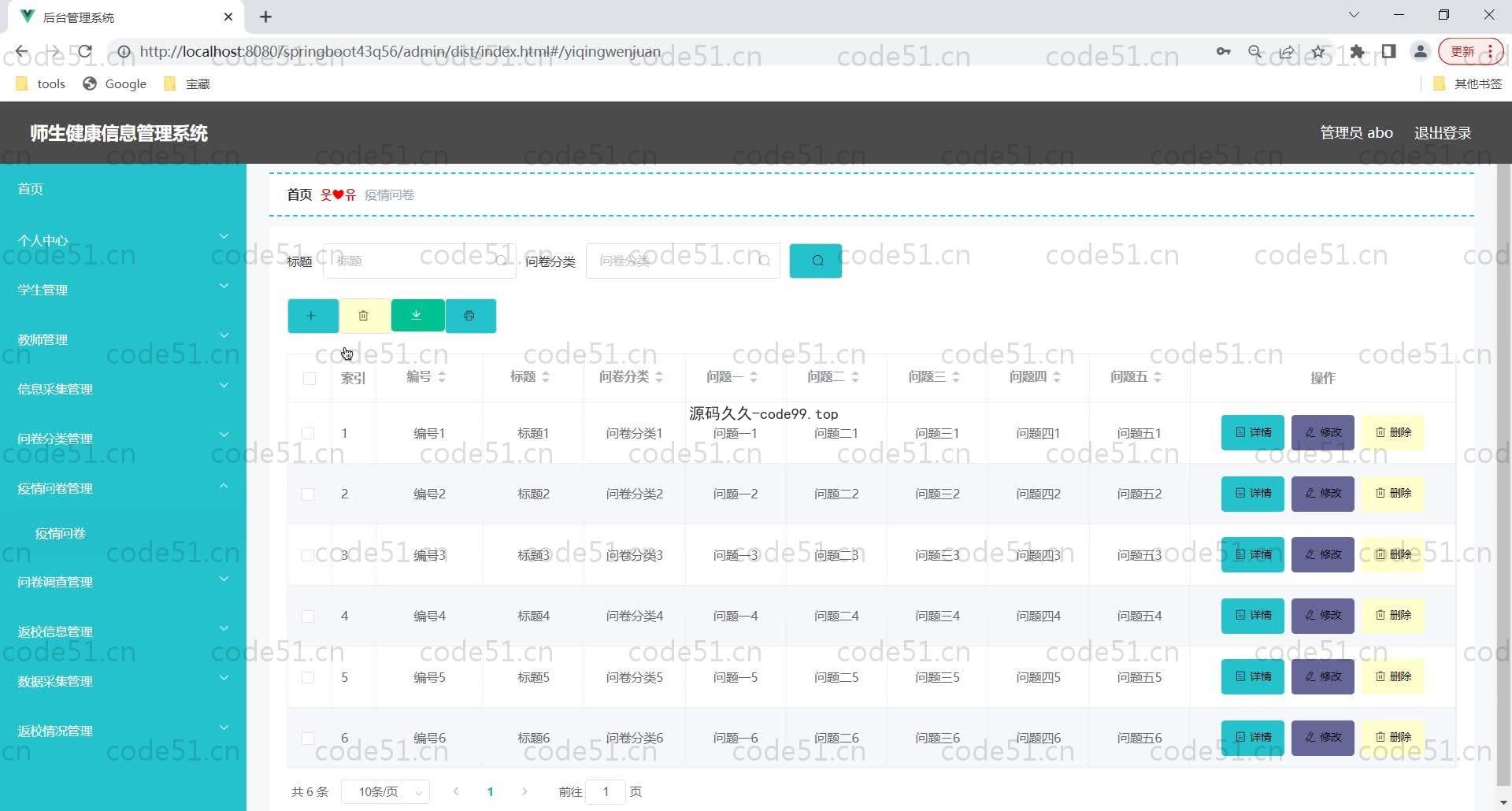 基于SpringBoot+MySQL+Vue的师生健康信息管理系统(附论文),管理员,用户角色等。基于java的师生健康信息管理系统,运用软件工程原理和开发方法,采用springboot框架构建的一个管理系统。整个开发过程首先对软件系统进行需求分析,得出系统的主要功能。接着对系统进行总体设计和详细设计。总体设计主要包括系统功能设计、系统总体结构设计、系统数据结构设计和系统安全设计等;详细设计主要包括系统数据库访问的实现,主要功能模块的具体实现,模块实现关键代码等。最后对系统进行功能测试,并对测试结果进行分析总结,得出系统中存在的不足及需要改进的地方,为以后的系统维护提供了方便,同时也为今后开发类似系统提供了借鉴和帮助。这种个性化的网上管理系统特别注重交互协调与管理的相互配合,激发了管理人员的创造性与主动性,对师生健康信息管理系统而言非常有利。