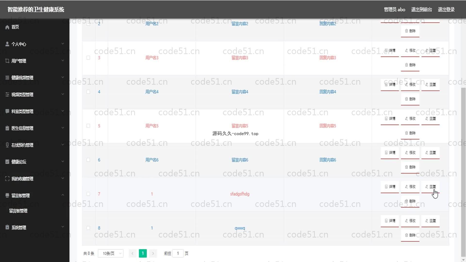 基于SpringBoot+MySQL+Vue的智能推荐卫生健康系统(附论文),管理员,用户角色等。智能推荐的卫生健康系统有管理员和用户两个角色。用户功能有个人中心,健康视频管理,视频类型管理,科室类型管理,医生信息管理,在线预约管理,我的收藏管理等。管理员功能有个人中心,用户管理,健康视频管理,视频类型管理,科室类型管理,医生信息管理,在线预约管理,健康论坛管理,我的收藏管理,留言板管理,系统管理等。因而具有一定的实用性。本站是一个B/S模式系统,采用Spring Boot框架,MYSQL数据库设计开发,充分保证系统的稳定性。系统具有界面清晰、操作简单,功能齐全的特点,使得基于智能推荐的卫生健康系统管理工作系统化、规范化。本系统的使用使管理人员从繁重的工作中解脱出来,实现无纸化办公,能够有效的提高基于智能推荐的卫生健康系统管理效率。