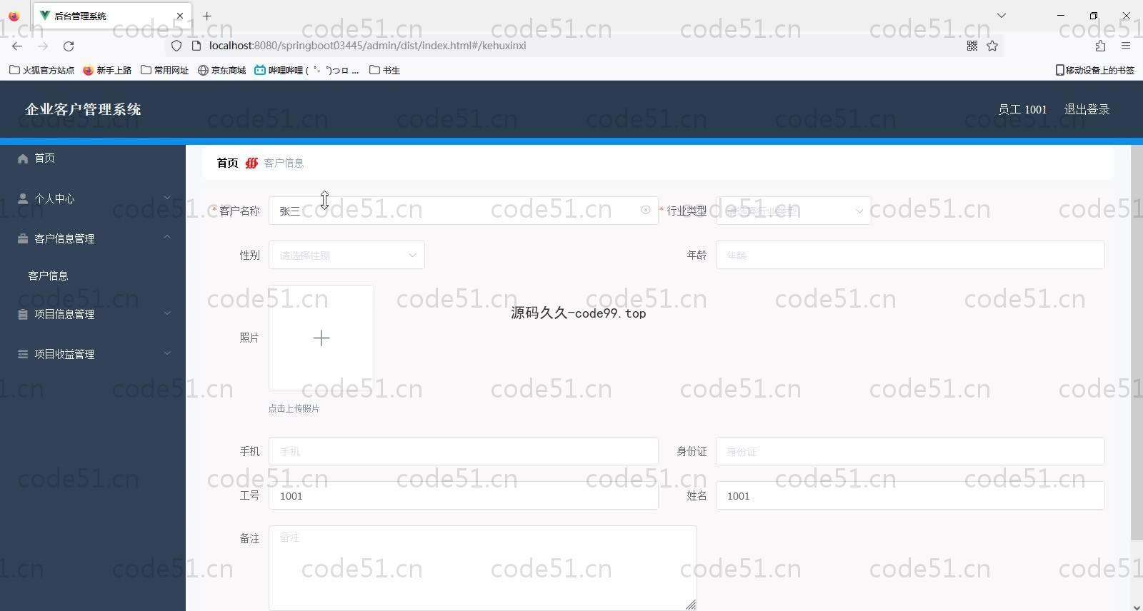 基于SpringBoot+MySQL+Vue的企业客户管理系统(附论文),管理员,用户角色等。企业客户管理系统的主要使用者分为管理员和员工,实现功能包括管理员:首页、个人中心、员工管理、客户信息管理、行业类型管理、项目信息管理、项目类型管理、项目收益管理,员工:首页、个人中心、客户信息管理、项目信息管理、项目收益管理等功能。由于本网站的功能模块设计比较全面,所以使得整个企业客户管理系统信息管理的过程得以实现。
