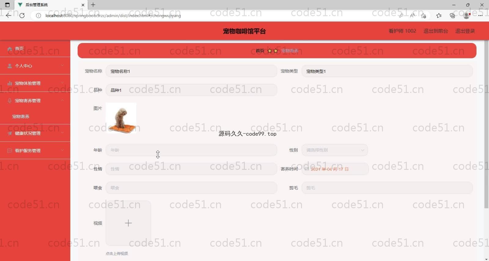 基于SpringBoot+MySQL+Vue的宠物咖啡馆平台(附论文),有管理员和用户以及看护师三个角色。用户功能有个人中心,咖啡菜品管理,菜品订单管理,宠物信息管理,宠物体验管理,宠物订单管理,宠物寄养管理,健康状况管理,看护服务管理,周边商品管理,商品购买管理,我的收藏管理等。管理员功能有个人中心,用户管理,看护师管理,咖啡菜品管理,菜品类型管理,菜品订单管理,宠物信息管理,宠物体验管理,宠物订单管理,宠物寄养管理,健康状况管理,互动项目管理,看护服务管理,周边商品管理,商品类型管理,商品购买管理,商品入库管理,系统管理等。看护师功能有个人中心,宠物体验管理,宠物寄养管理,健康状况管理,看护服务管理等。因而具有一定的实用性。本站是一个B/S模式系统,采用SSM框架,MYSQL数据库设计开发,充分保证系统的稳定性。系统具有界面清晰、操作简单,功能齐全的特点,使得基于Spring Boot的宠物咖啡馆平台的设计与实现管理工作系统化、规范化。本系统的使用使管理人员从繁重的工作中解脱出来,实现无纸化办公,能够有效的提高基于Spring Boot的宠物咖啡馆平台的设计与实现管理效率。