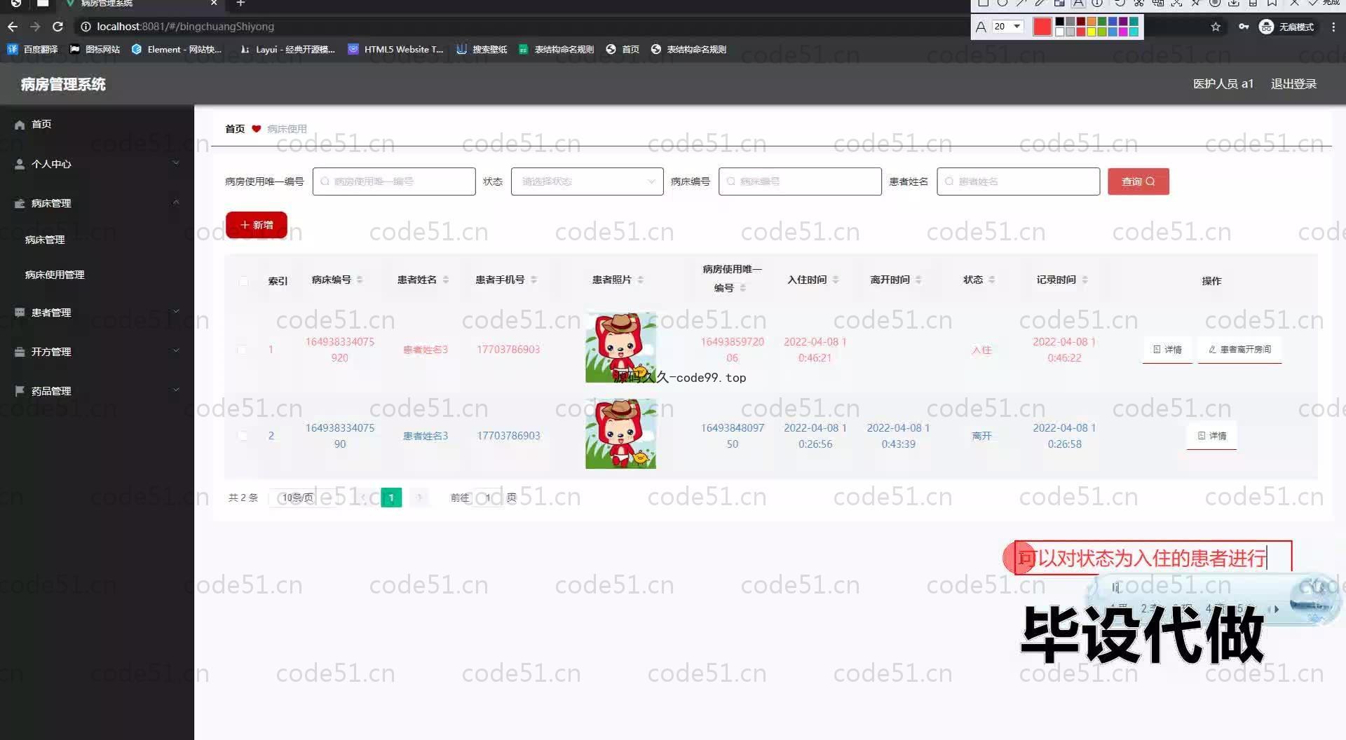 基于SpringBoot+MySQL+SSM+Vue.js的病房管理系统(附论文),用户,管理员角色等(具体看下演示视频提供)。当下,如果还依然使用纸质文档来记录并且管理相关信息,可能会出现很多问题,比如原始文件的丢失,因为采用纸质文档,很容易受潮或者怕火,不容易备份,需要花费大量的人员和资金来管理用纸质文档存储的信息,最重要的是数据出现问题寻找起来很麻烦,并且修改也困难,如果还这样操作会造成很大的资源浪费和经济损失。所以,对于本课题研究的病房信息的管理就需要有一款软件来代替手工操作,因此病房管理系统就应运而生。