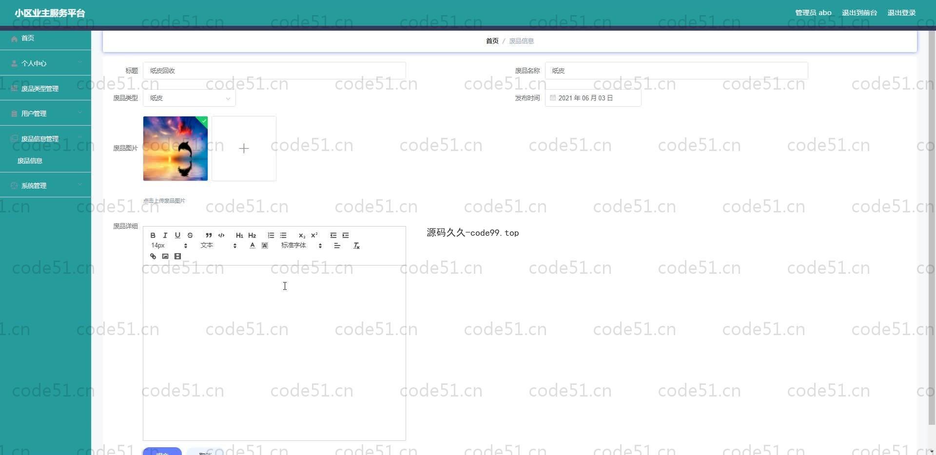 基于SpringBoot+MySQL+SSM+Vue.js的小区业主服务系统(附论文),用户,管理员角色等(具体看下演示视频提供)。小区业主服务平台在对开发工具的选择上也很慎重,为了便于开发实现,选择的开发工具为Eclipse,选择的数据库工具为Mysql。以此搭建开发环境实现小区业主服务平台的功能,其管理员管理用户,管理废品类型,管理公告,管理废品信息,管理投诉物业信息。用户查看废品信息,查看公告,投诉物业,发布废品信息。