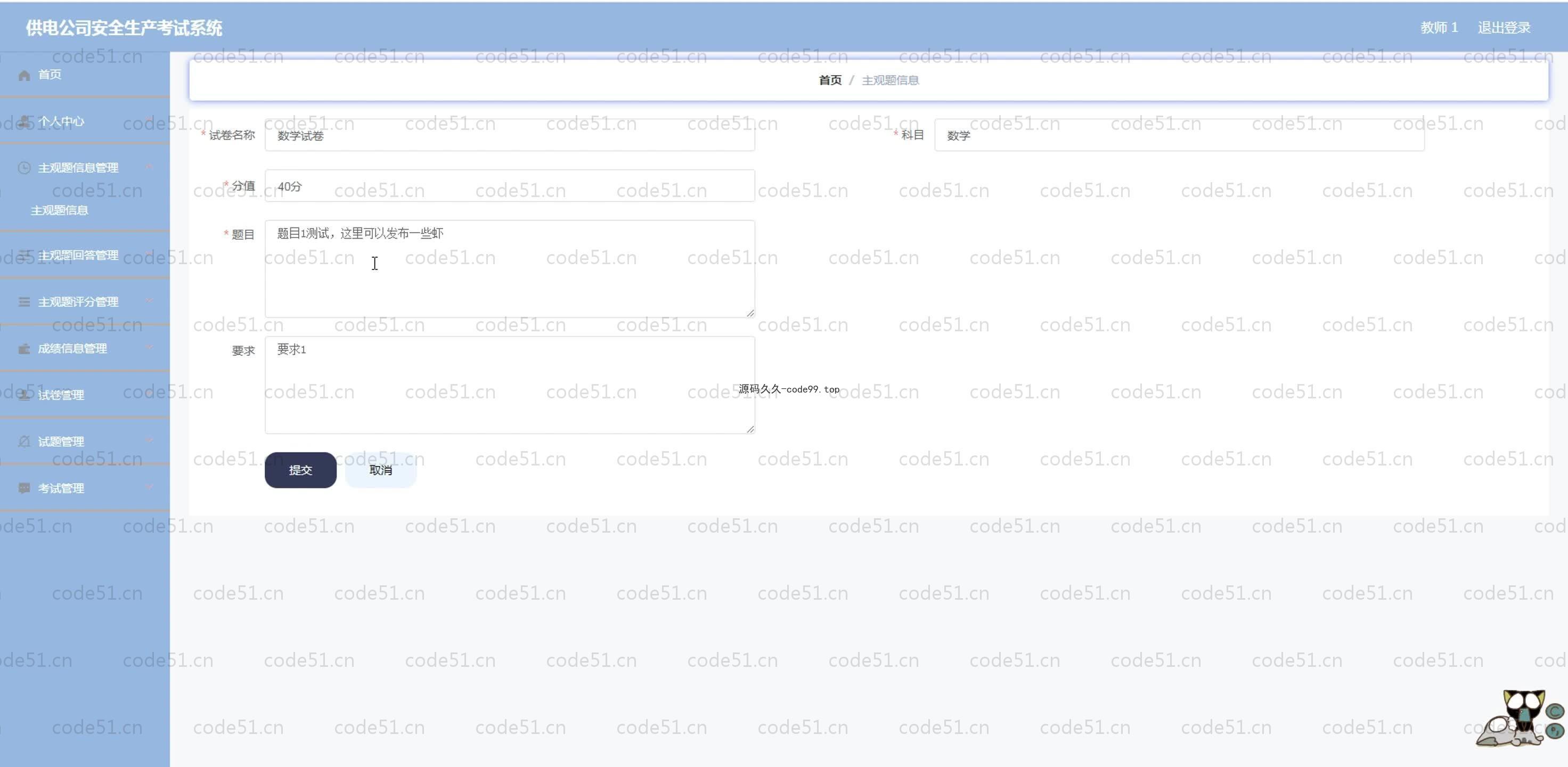 这次开发的供电公司安全生产考试系统管理员,教师,学生。管理员功能有个人中心,学生管理,教师管理,主观题信息管理,主观题回答管理,主观题评分管理,成绩信息管理,试卷管理,试题管理,考试管理。教师可以发布考试信息,学生进行考试。经过前面自己查阅的网络知识,加上自己在学校课堂上学习的知识,决定开发系统选择B/S模式这种高效率的模式完成系统功能开发。这种模式让操作员基于浏览器的方式进行网站访问,采用的主流的Java语言这种面向对象的语言进行供电公司安全生产考试系统程序的开发,在数据库的选择上面,选择功能强大的MySQL数据库进行数据的存放操作。