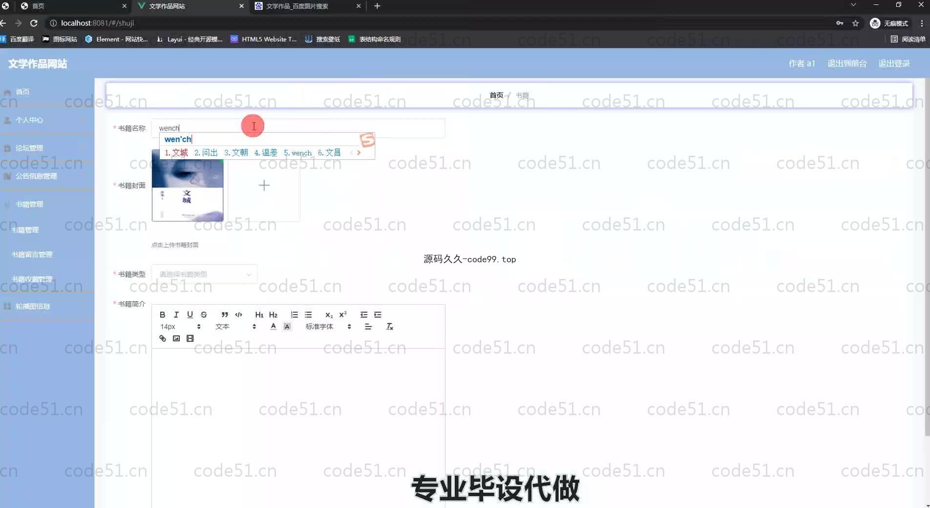基于SpringBoot+MySQL+SSM+Vue.js的中国文学作品系统(附论文),用户,管理员角色等(具体看下演示视频提供)。信息数据从传统到当代,是一直在变革当中,突如其来的互联网让传统的信息管理看到了革命性的曙光,因为传统信息管理从时效性,还是安全性,还是可操作性等各个方面来讲,遇到了互联网时代才发现能补上自古以来的短板,有效的提升管理的效率和业务水平。传统的管理模式,时间越久管理的内容越多,也需要更多的人来对数据进行整理,并且数据的汇总查询方面效率也是极其的低下,并且数据安全方面永远不会保证安全性能。结合数据内容管理的种种缺点,在互联网时代都可以得到有效的补充。结合先进的互联网技术,开发符合需求的软件,让数据内容管理不管是从录入的及时性,查看的及时性还是汇总分析的及时性,都能让正确率达到最高,管理更加的科学和便捷。本次开发的中国文学作品网站实现了字典管理、论坛管理、公告信息管理、书籍管理、书籍收藏管理、书籍留言管理、用户管理、章节管理、作者管理、管理员管理等功能。系统用到了关系型数据库中王者MySql作为系统的数据库,有效的对数据进行安全的存储,有效的备份,对数据可靠性方面得到了保证。并且程序也具备程序需求的所有功能,使得操作性还是安全性都大大提高,让中国文学作品网站更能从理念走到现实,确确实实的让人们提升信息处理效率。