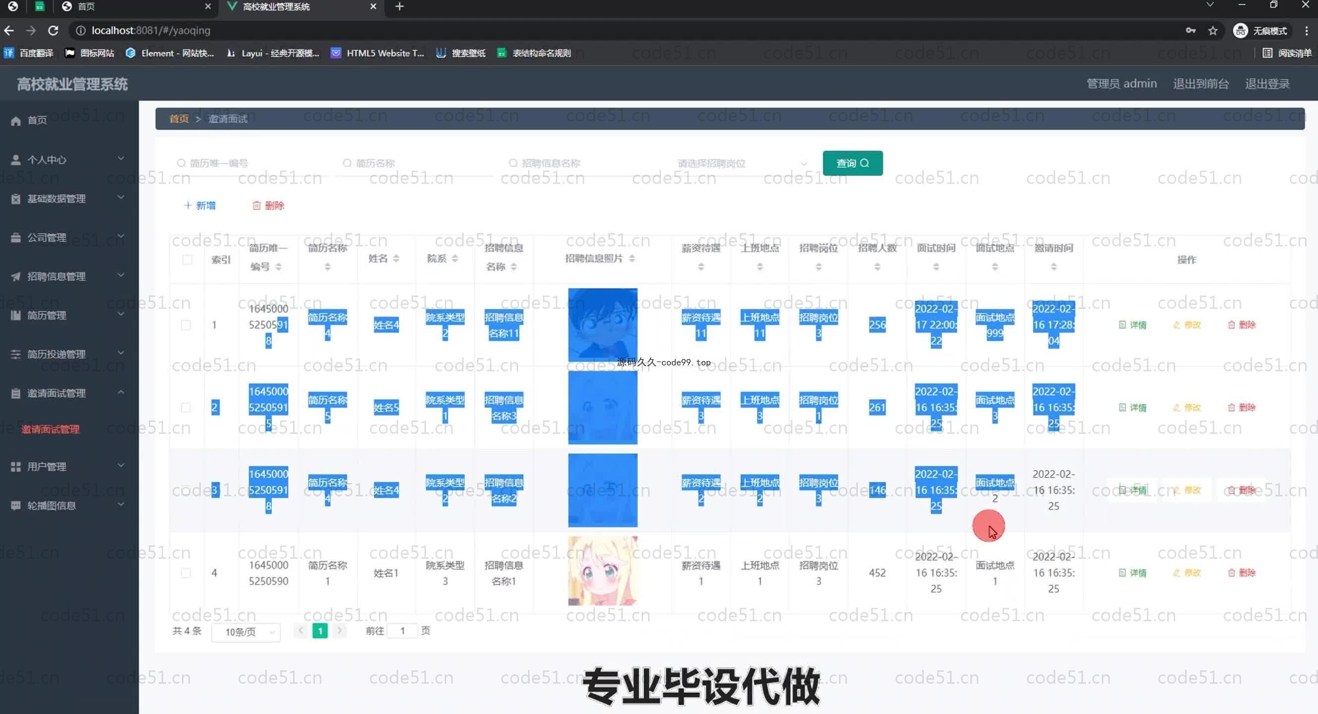 高校就业管理系统通过MySQL数据库与Eclipse工具进行开发,高校就业管理系统能够实现招聘信息管理,简历管理,邀请面试管理,简历投递管理,用户管理,公司管理等功能。