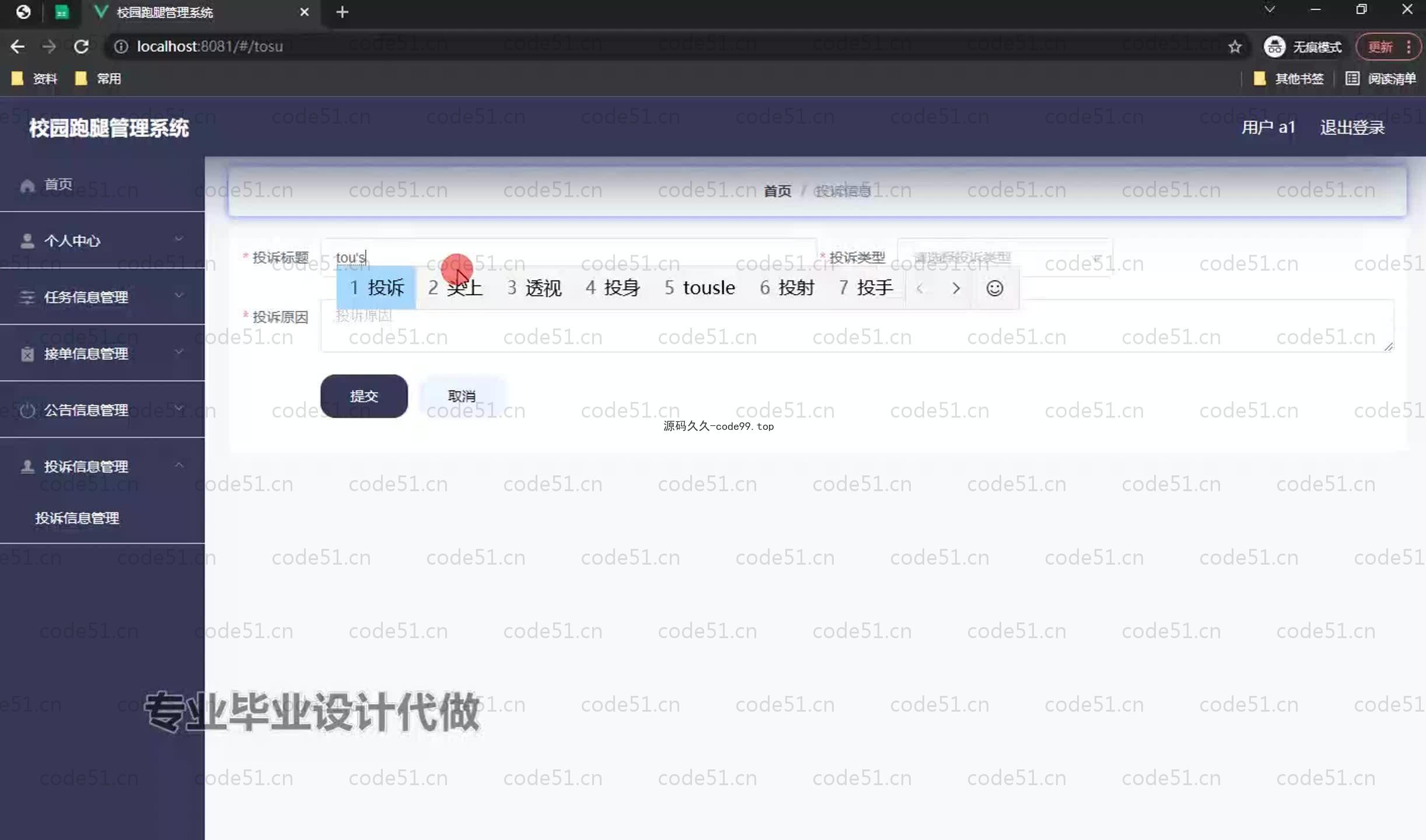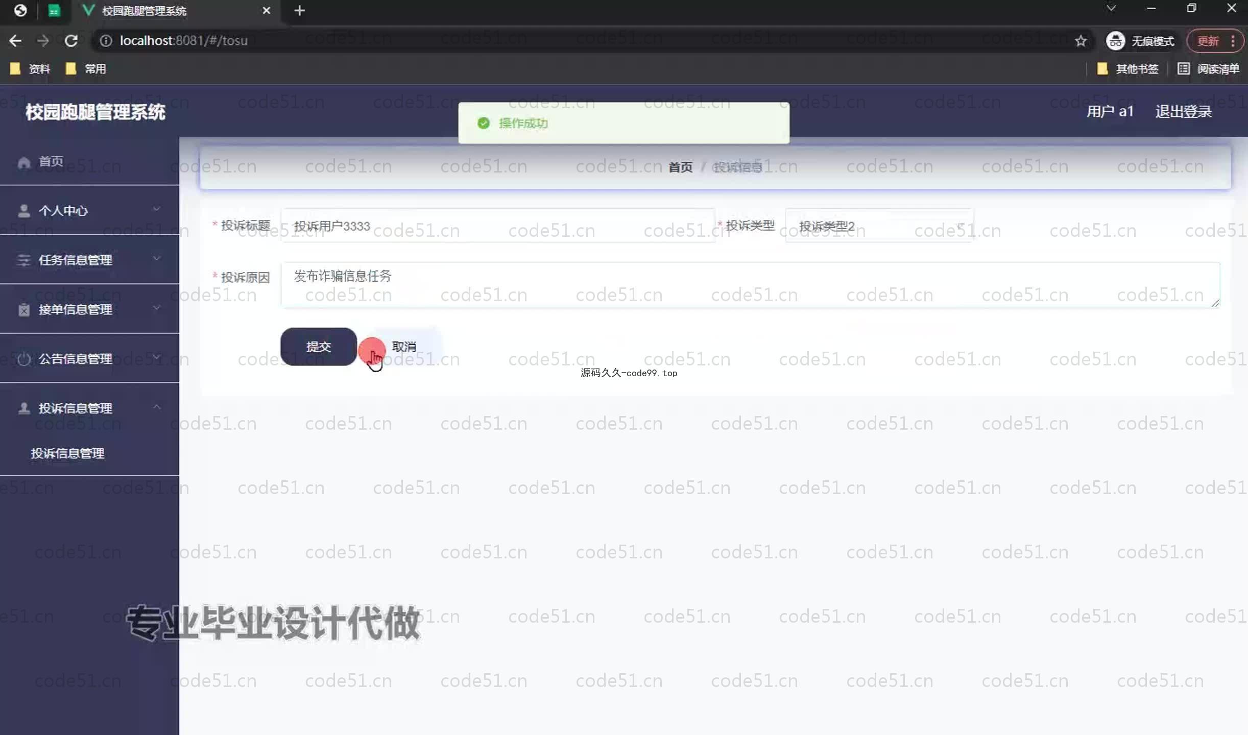 基于SpringBoot+MySQL+SSM+Vue.js的校园跑腿系统(附论文),用户,管理员角色等(具体看下演示视频提供)。传统办法管理信息首先需要花费的时间比较多,其次数据出错率比较高,而且对错误的数据进行更改也比较困难,最后,检索数据费事费力。因此,在计算机上安装校园跑腿管理系统软件来发挥其高效地信息处理的作用,可以规范信息管理流程,让管理工作可以系统化和程序化,同时,校园跑腿管理系统的有效运用可以帮助管理人员准确快速地处理信息。