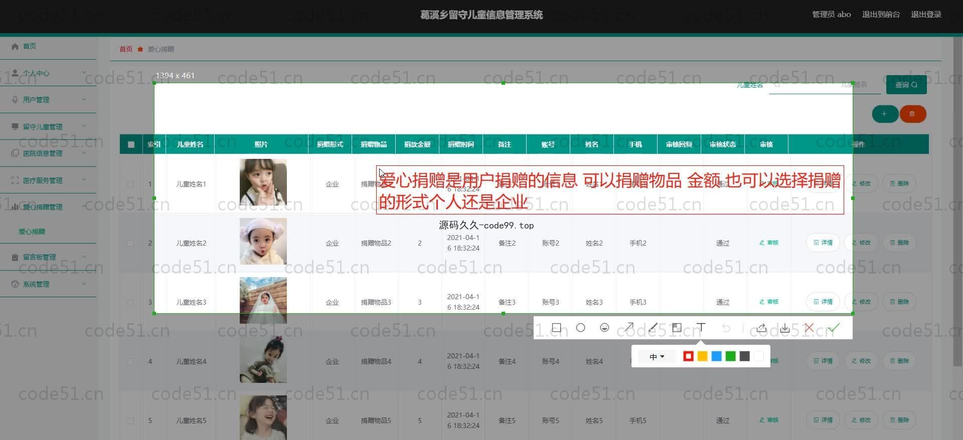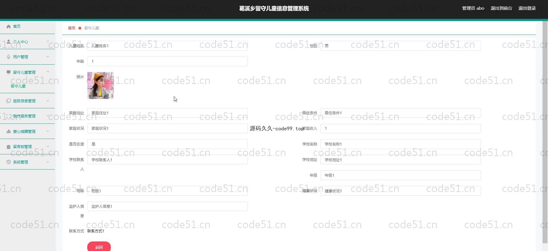 本葛溪乡留守儿童信息管理系统有管理员和用户两个角色。管理员功能有个人中心,用户管理,留守儿童管理,医院信息管理,医疗服务管理,爱心捐赠管理,留言板管理,系统管理。用户可以注册登录,查看留守儿童信息,对留守儿童信息进行联系医生和爱心捐赠。因而具有一定的实用性。
