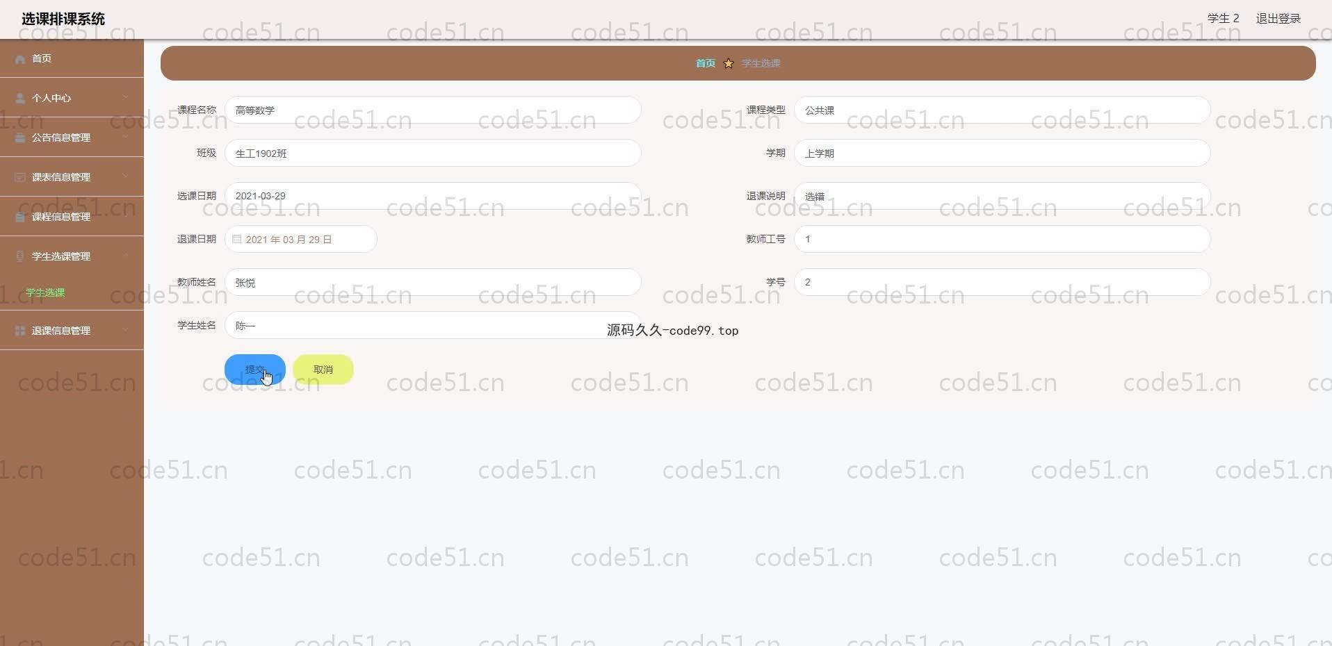 基于SpringBoot+MySQL+SSM+Vue.js的选课排课系统(附论文),用户,管理员角色等(具体看下演示视频提供)。互联网的普及,改变了人们正常的生活学习及消费习惯,而且也大大的节省了人们的时间,由于各种管理系统都再不断的增加,更方便了用户,也改良了很多的用户习惯。对于选课排课系统查询方面缺乏系统的管理方式,为提高选课排课系统效率,特开发了本选课排课系统。