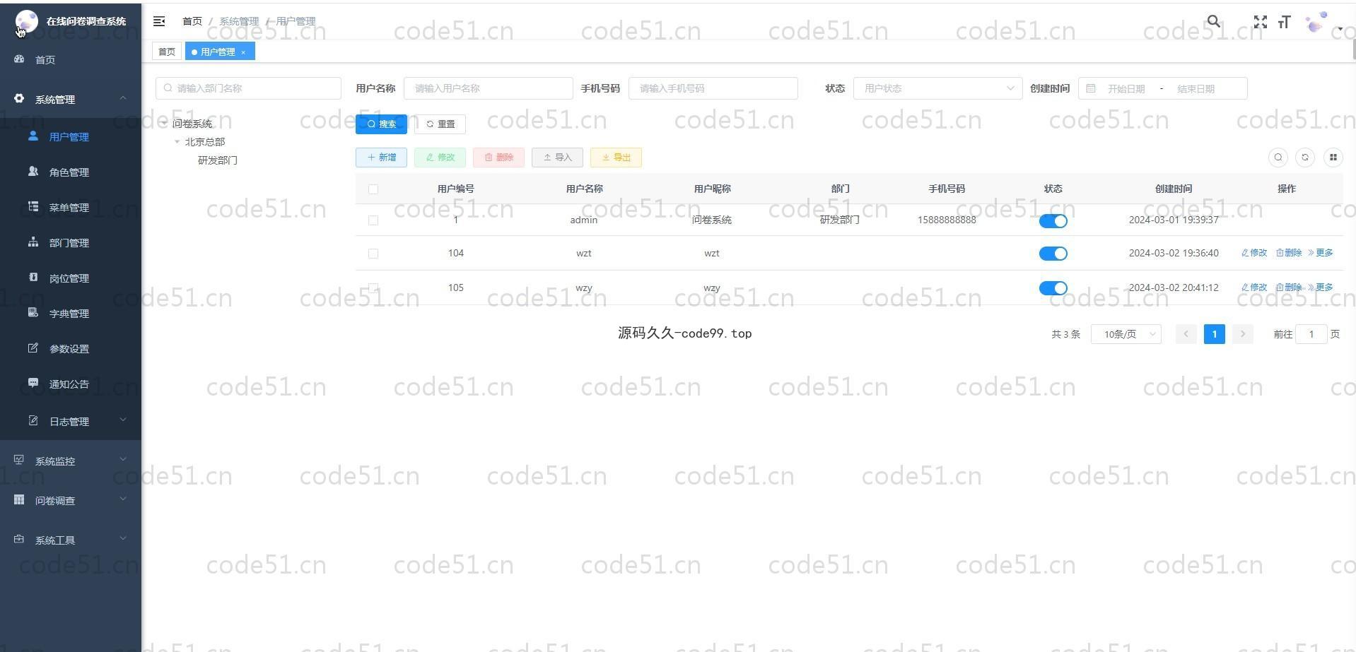 基于SpringBoot+Vue前后端分离的在线问卷调查系统,用户,管理员角色等(具体看下演示视频提供)。用户管理,角色管理,菜单管理,部门管理,岗位管理,字典管理,参数设置,问卷调查管理等。