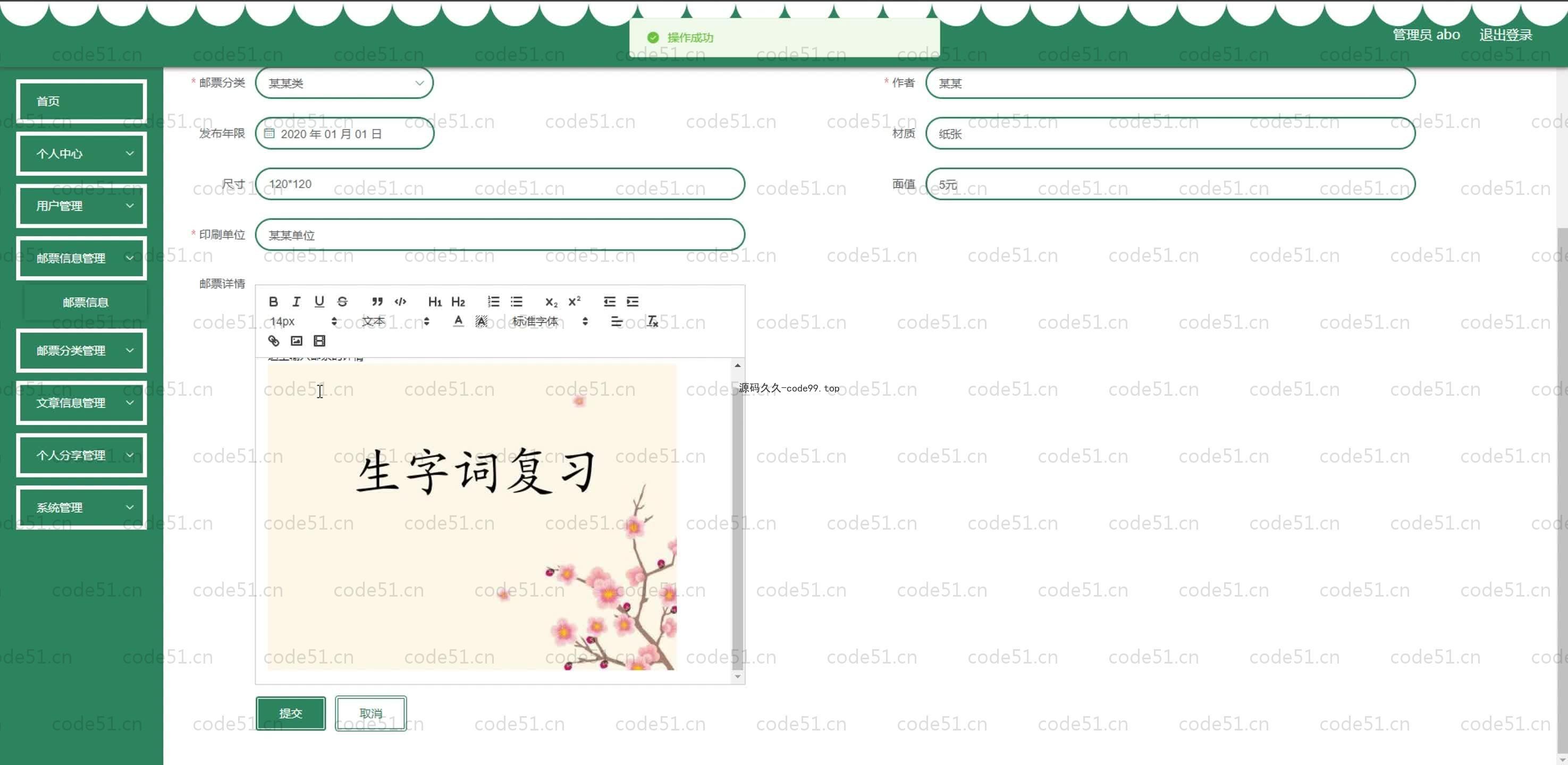 基于SpringBoot+MySQL+SSM+Vue.js的邮票鉴赏系统(附论文),用户,管理员角色等(具体看下演示视频提供)。网络的广泛应用给生活带来了十分的便利。所以把邮票鉴赏管理与现在网络相结合,利用java技术建设邮票鉴赏系统,实现邮票鉴赏的信息化。则对于进一步提高邮票鉴赏管理发展,丰富邮票鉴赏管理经验能起到不少的促进作用。