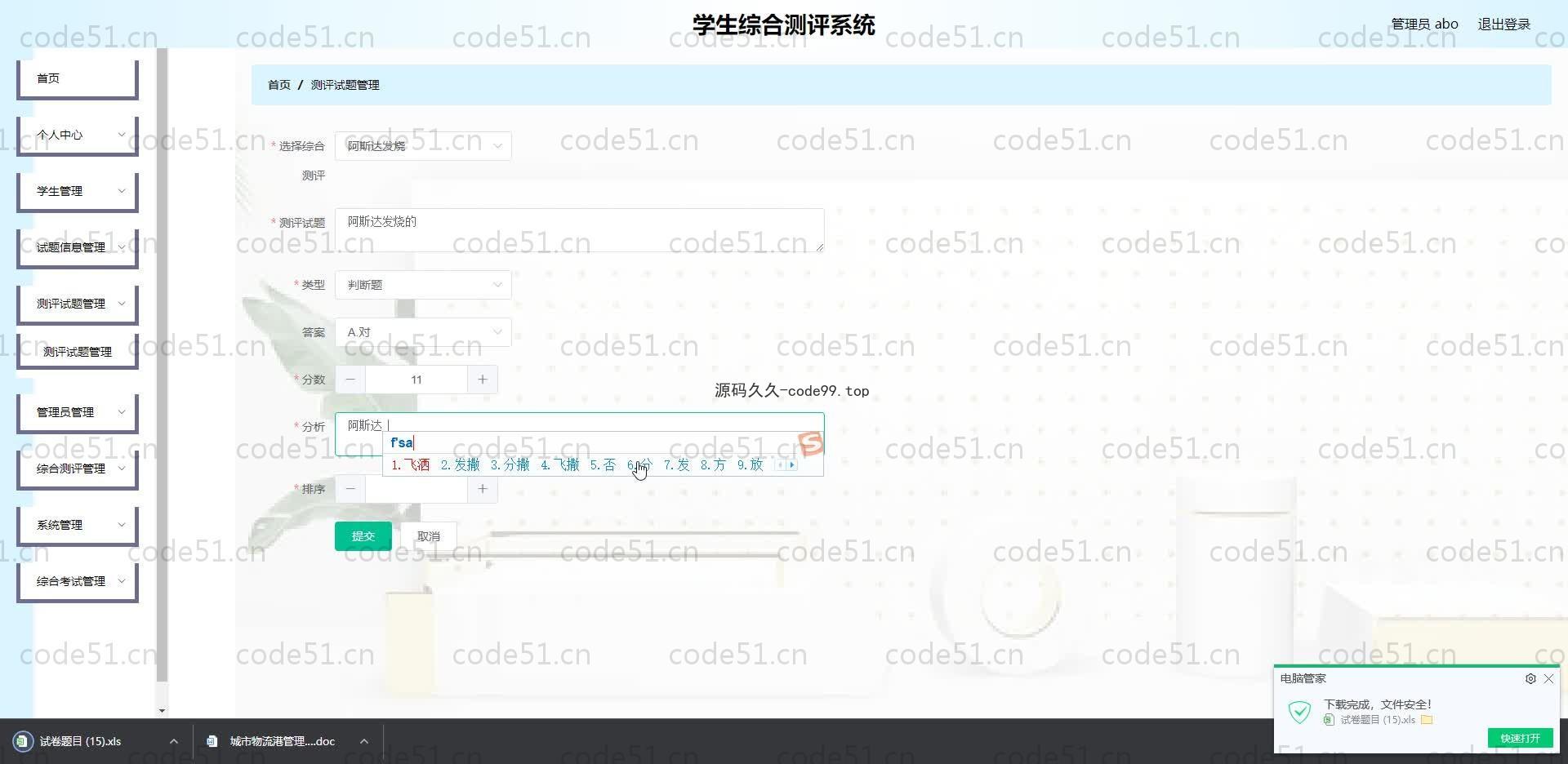 本学生综合测评系统以springboot作为框架,b/s模式以及MySql作为后台运行的数据库,同时使用Tomcat用为系统的服务器。本系统主要包括首页,个人中心,学生管理,试题信息管理,测评试题管理,管理员管理,综合测评管理,系统管理,综合考试管理等功能,通过这些功能的实现基本能够满足日常学生综合测评管理的操作。
