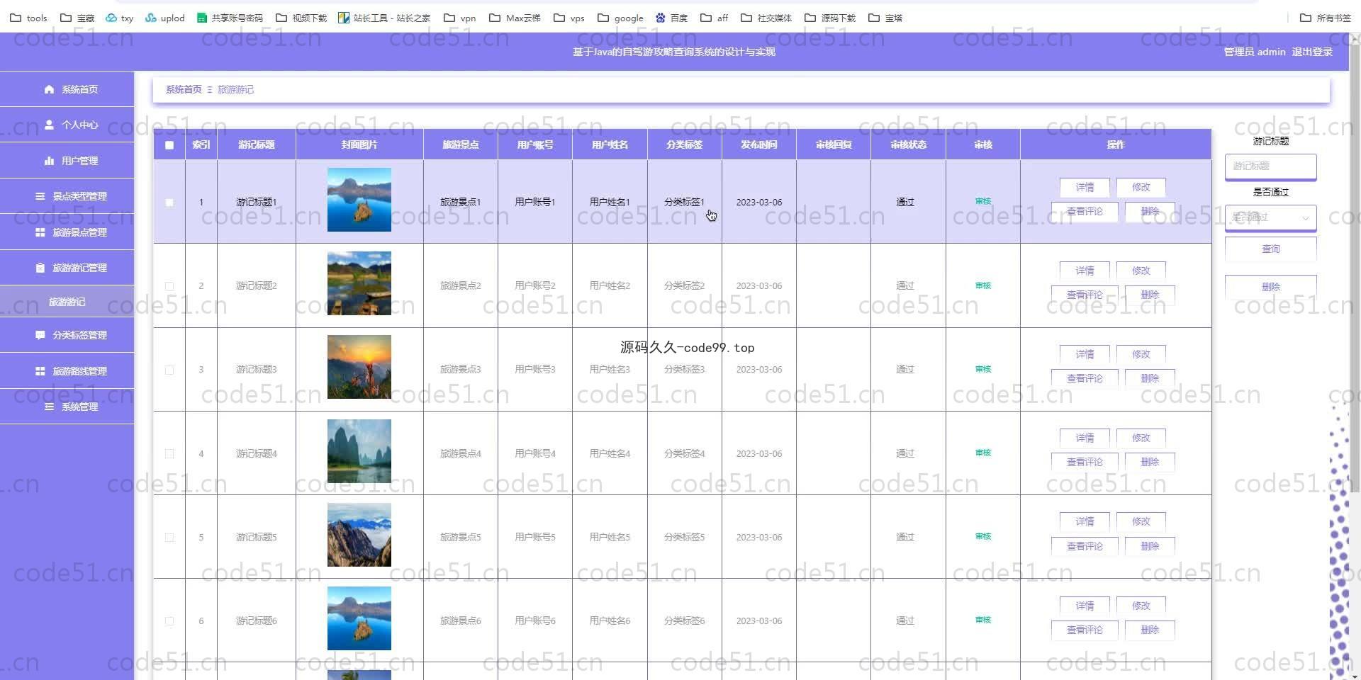 该自驾游攻略查询系统采用B/S架构进行设计,并采用java语言以及springboot框架进行开发。该系统主要设计并完成了管理过程中的用户注册登录、个人信息修改、用户、景点类型、旅游景点、旅游游记、分类标签、旅游路线等功能。该系统操作简便,界面设计简洁,不但可以基本满足本行业的日常管理工作,同时又可以有效减少人员成本和时间成本,为自驾游攻略查询管理工作提供了方便。