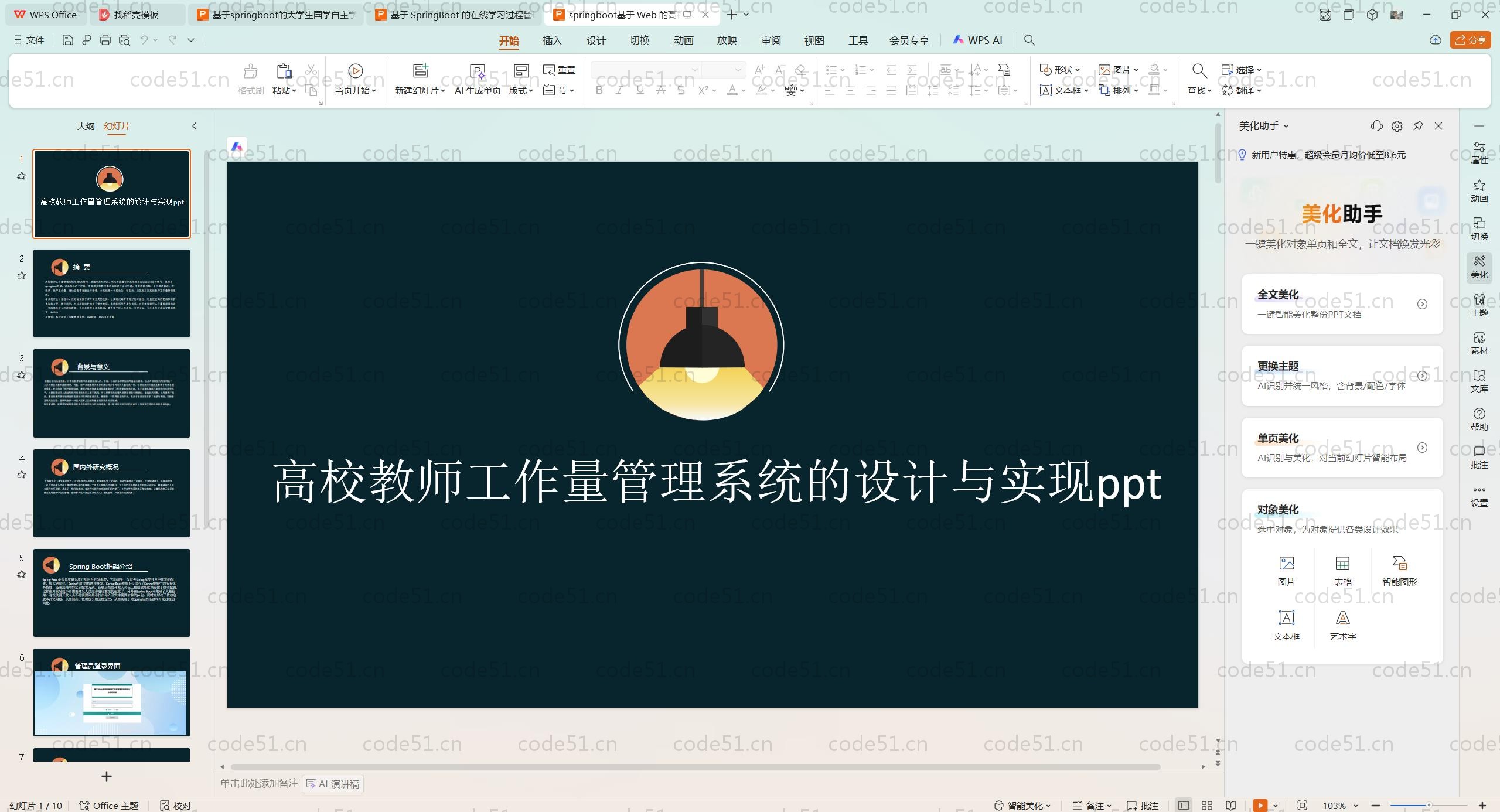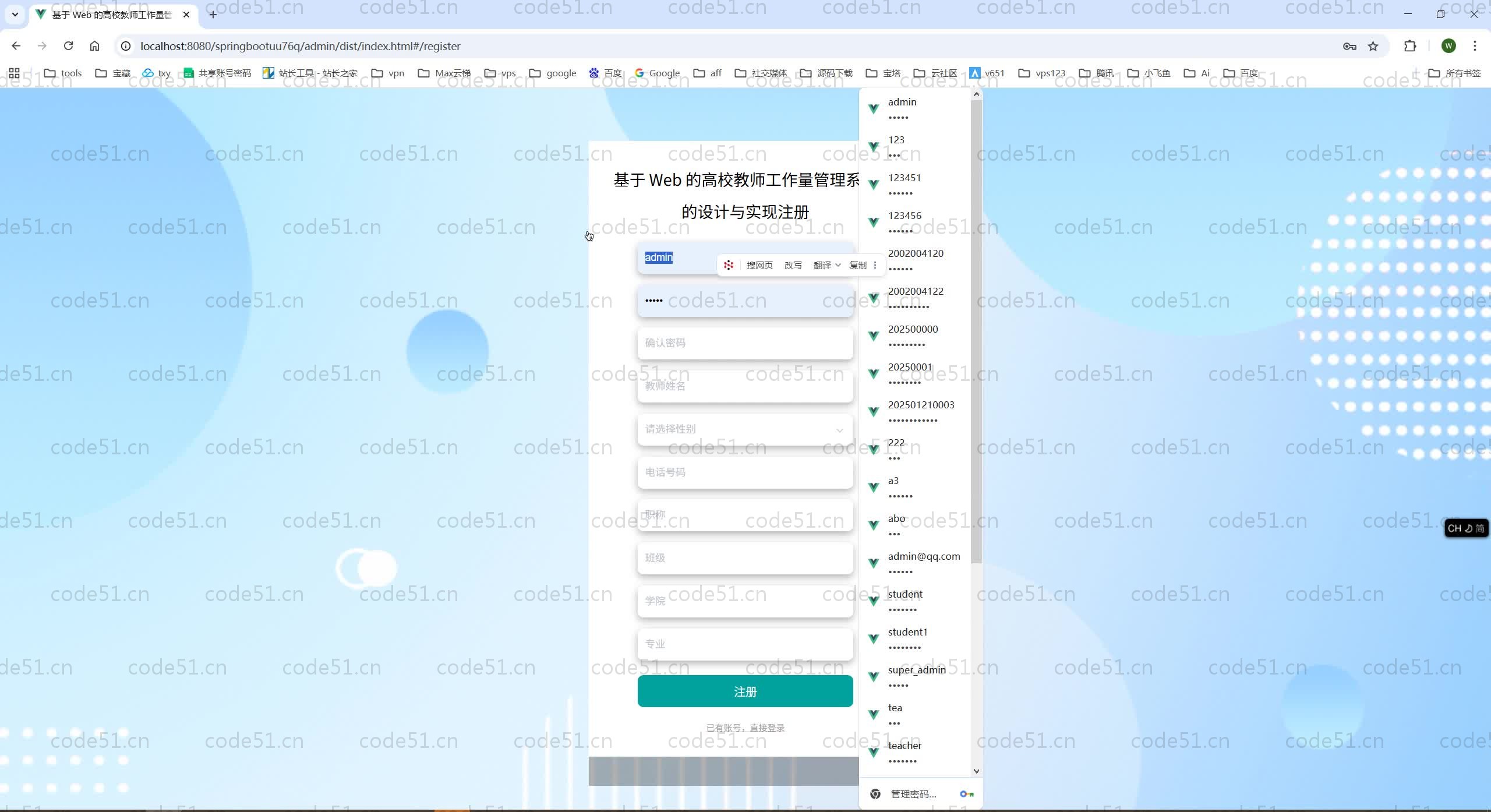 基于SpringBoot+MySQL+Vue.js的高校教师工作量管理系统(附论文),用户,管理员角色等(具体看下演示视频提供)。高校教师工作量管理系统采用B/S架构,数据库是MySQL。网站的搭建与开发采用了先进的java进行编写,使用了springboot框架。该系统从两个对象:由管理员和教师来对系统进行设计构建。主要功能包括:个人信息修改,对教师、教师工作量、通知公告等功能进行管理。本系统是一个高效的、动态的、交互友好的高校教师工作量管理系统。