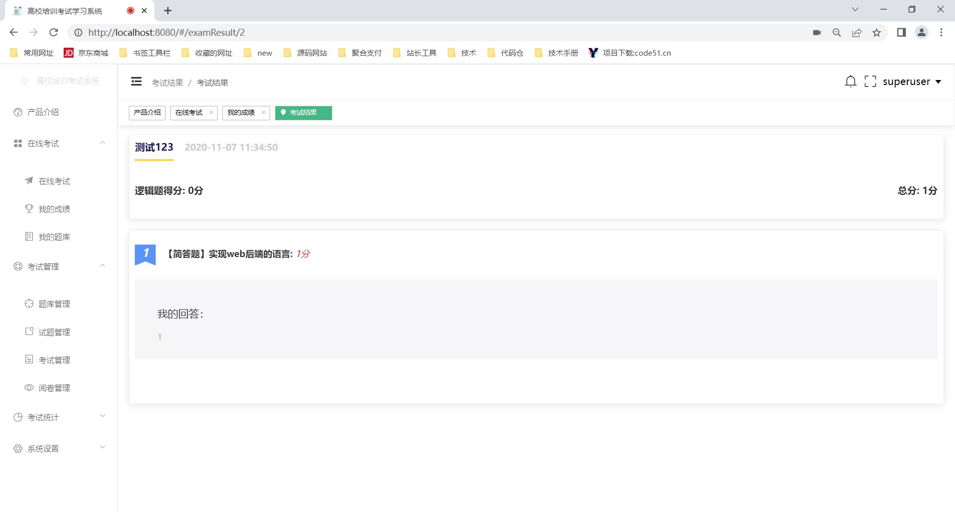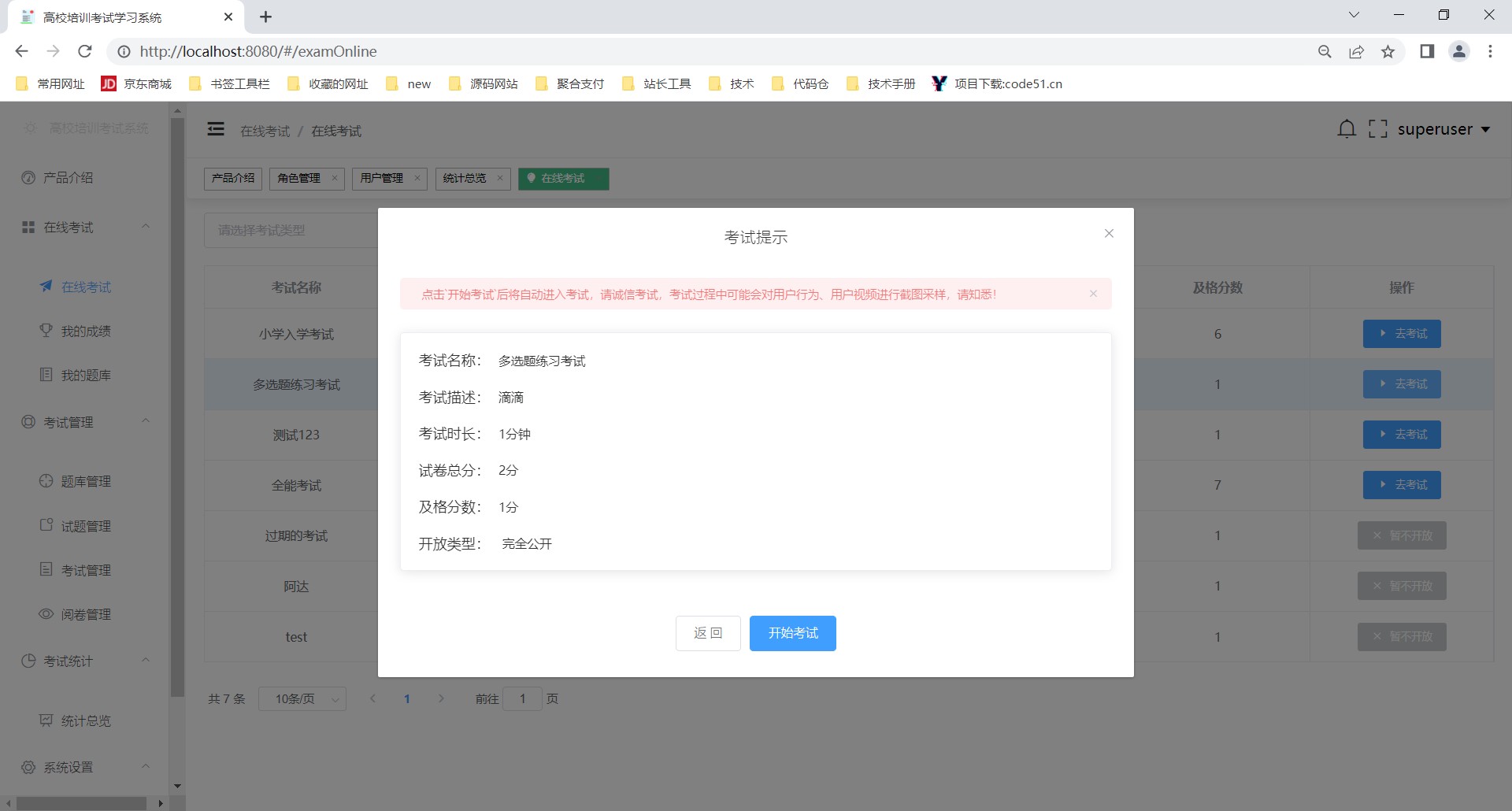 基于SSM+SpringBoot+MySQL+Vue的高校培训考试学习管理系统,分为学生,教师,管理员角色。整体功能包含题库管理,考试管理,试题管理,在线考试,我的成绩,我的题库,角色管理,用户管理,统计总览,阅卷管理,考试管理,试题管理。下载地址源码乐园http://code51.cn